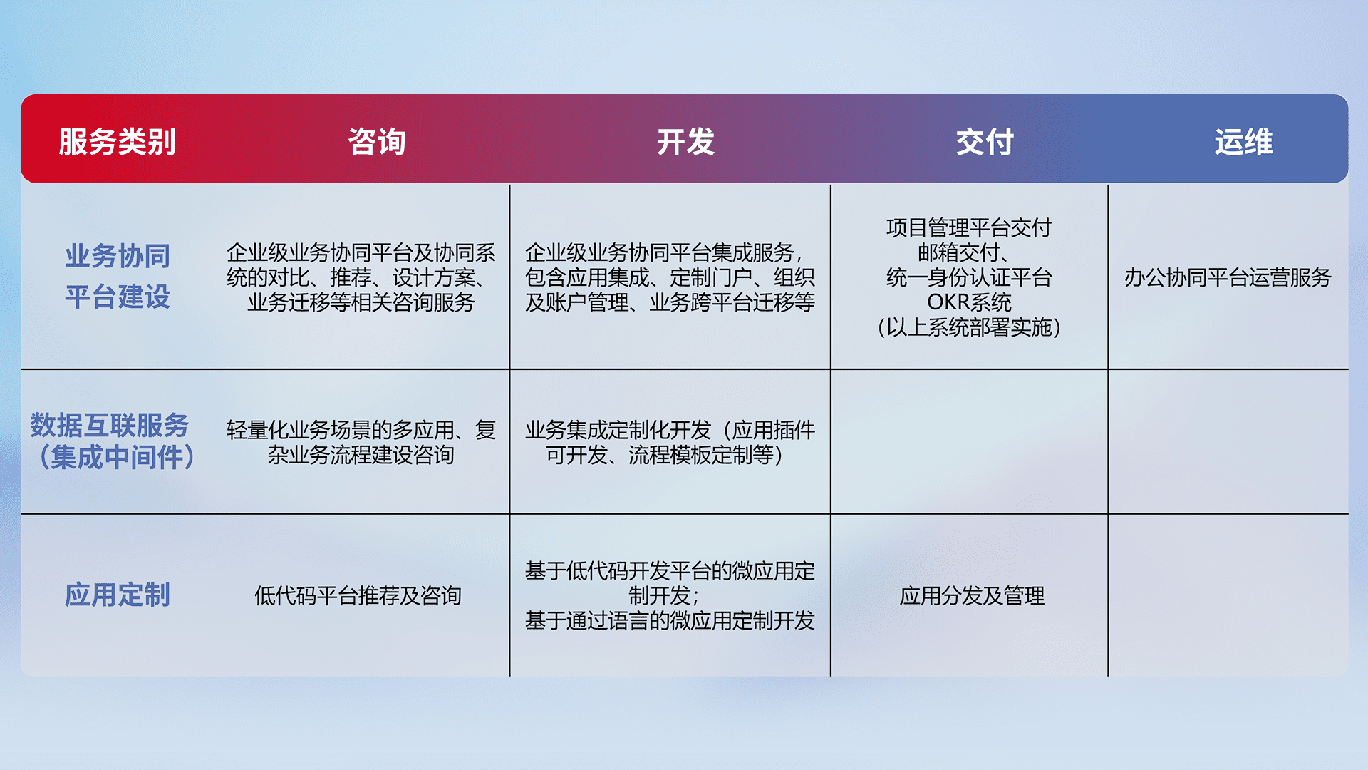 针对钉钉、、企微、、IDaas等平台级产品提供产品的规划、、、方案、、交付、、定制化开发等服务,,,实现如统一协同办公、、、智能客户服务、、、混合会议管理、、智能数据查询、、、等业务场景,,实现数字化转型。。