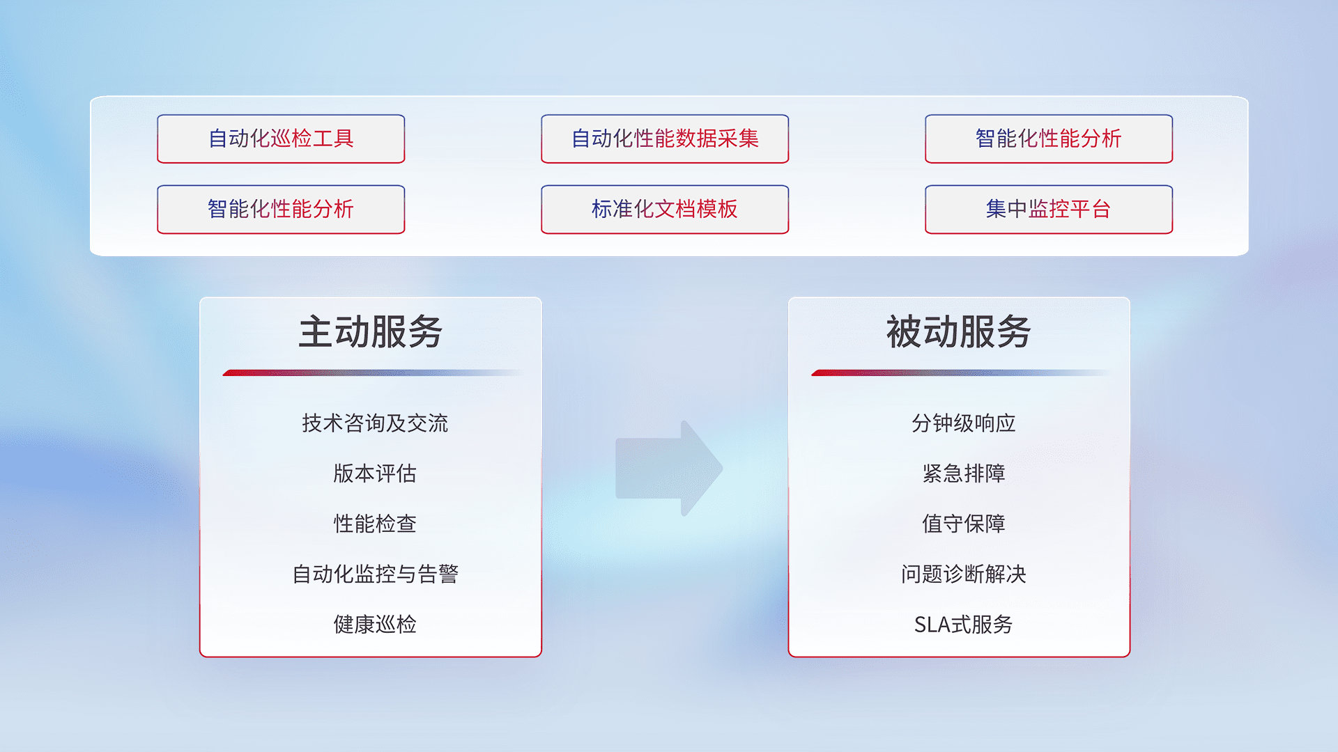 智能化工具和标准化文档,,,,保障服务质量,,,提供主动服务(包含技术咨询、、版本评估、、、性能检查、、自动化监控与告警、、健康巡检)和被动服务包含(分钟级响应、、紧急排障、、、、值守保障、、、问题诊断解决、、SLA服务)。。。。