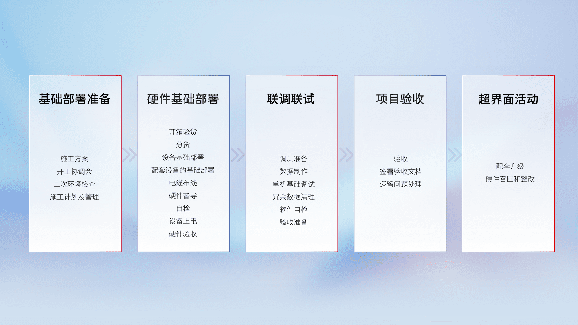 从基础部署准备、、、硬件基础部署、、联调联试、、、项目验收、、、、越界面活动的全过程可追溯,,保证施工质量和进度。。。